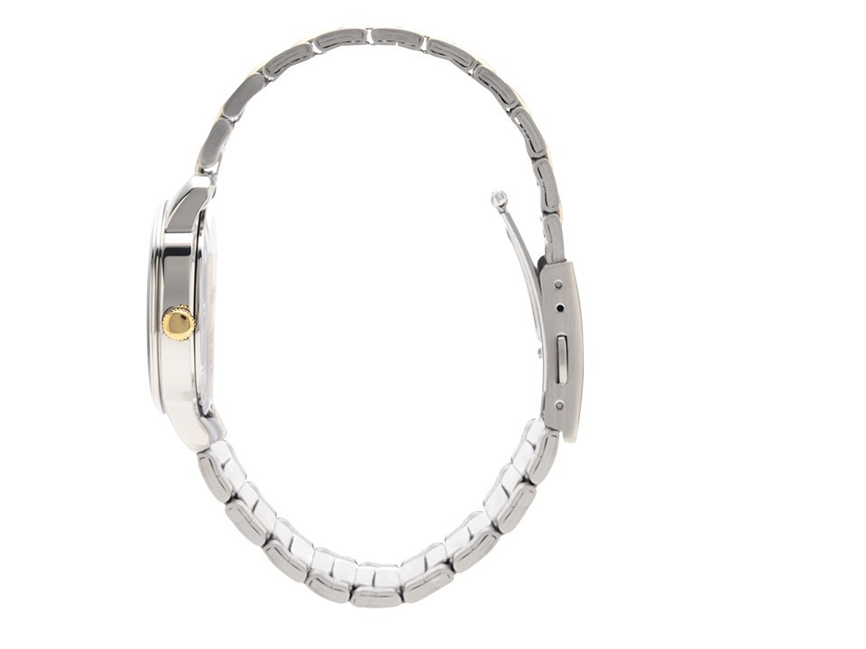 Корпус и браслет из нержавеющей стали. Серебряный циферблат с золотыми тонами и указателями. Минутные маркеры вокруг внешнего обода. Тип: аналоговый. Отображение даты в положении «3 часа». Кварцевый механизм. Устойчивое к царапинам стекло Hardlex. Размер корпуса: 30 мм. Толщина корпуса: 7 мм. Круглый корпус. Ширина браслета: 12 мм. Зажим для кнопки. Водонепроницаемость 50 метров / 165 футов. Функции: дата, час, минута, секунда.