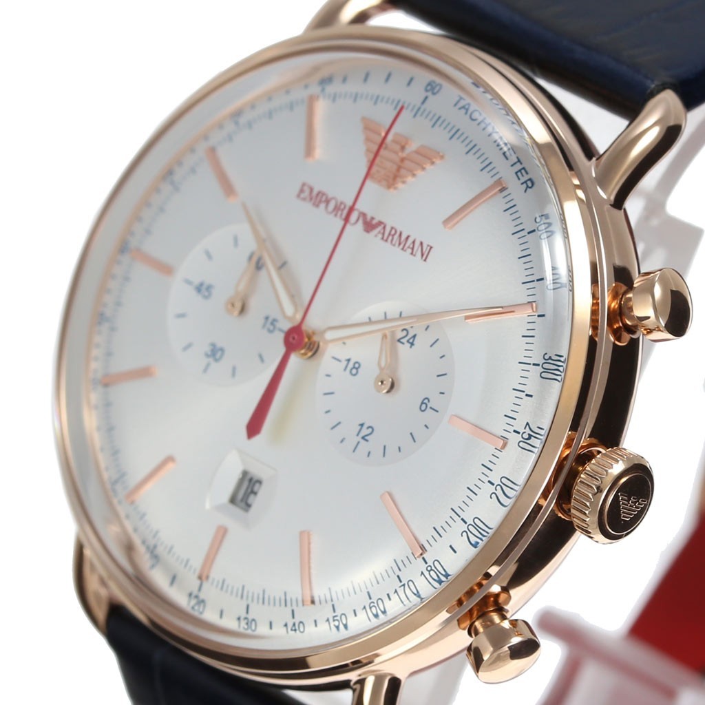 Эти вдохновленные авиатором мужские часы от Emporio Armani стильно оснащены полированным корпусом с PVD покрытием цвета розового золота, хрустальной куполообразной линзой, закругленными наконечниками, серебряным циферблатом и хронографами. Синим ремешк из кожи с тиснением под крокодила снаружи, внутри - красного Цвета.