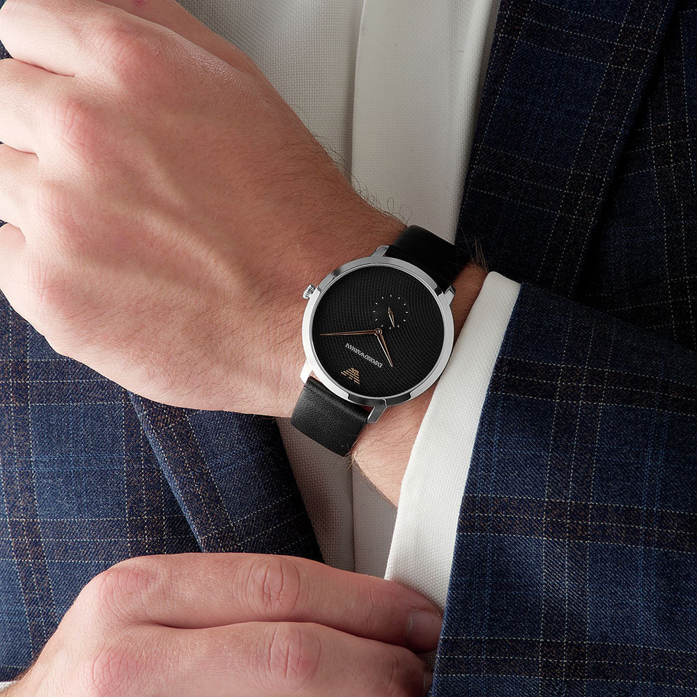 Эти 42-миллиметровые часы оснащены серым циферблатом с одним дополнительным циферблатом, механизмом с тремя стрелками и черным кожаным ремешком.