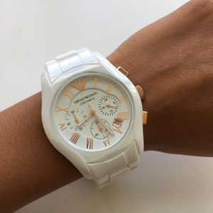 Белый керамический корпус с белым керамическим браслетом. Фиксированная белый керамический безель. Белый циферблат со светящимися стрелками из розового золота и часовыми метками с римскими цифрами. Логотип Emporio Armani в положении «12 часов». Тип часов: аналоговый. Люминесцентные стрелки. Отображение даты между 4 и 5 часами позиции. Хронограф - отображение трех вспомогательных циферблатов: 60 секунд, 60 минут и 24 часа. Кварцевый механизм. Устойчивое к царапинам минеральное стекло. Диаметр корпуса: 38 мм. Толщина корпуса: 12 мм. Круглая форма корпуса. Ширина браслета: 18 мм. Разворачивающаяся застежка с кнопкой разблокировки. Водонепроницаемость на 30 метров / 100 футов. Повседневный стиль часов. AR1416.
