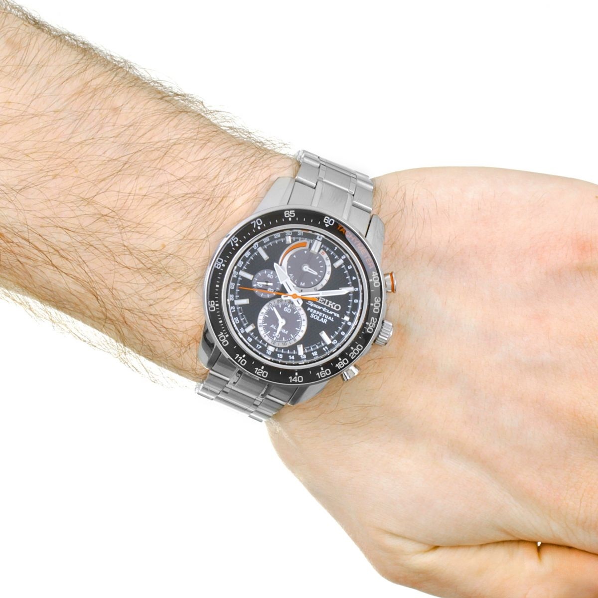 Японский кварцевый механизм SEIKO, калибр Solar V198. Механизм с аналоговой индикацией сочетает систему позарядки Solar с функцией вечного календаря Perpetual. Точность хода +/-15 сек в месяц. Система Solar использует для питания часов электрическую энергию, которую вырабатывает солнечная батарея, «спрятанная» под циферблатом. Накапливаемая таким образом электроэнергия сохраняется в аккумуляторе с высокой емкостью. В отличие от традиционного элемента питания, аккумуляторная батарея не нуждается в частой замене. Функцией вечного календаря Perpetual учитывает четные и нечетные месяцы (30 и 31 числа), високосные годы, и не требующего дополнительной коррекции вплоть до 2100 года. Центральные часовая и минутная стрелки, маленький секундный индикатор на «9 часах». Отображение даты и года в високосном цикле при помощи центральной стрелки. День недели на многофункциональном индикаторе на «12 часах». Индикатор на «12 часах» отображает выбранный режим или уровень заряда аккумулятора. В зависимости от выбранного режима, совмещенный индикатор со стрелками в 24-часовом и 60-минутном формате служит для отображения хронографа или установки будильника. Хронограф с центральной секундной стрелкой, общее время измерений 24 часа, точность измерений 1/5 секунды. Режимы: ADD - измерение времени с перерывом и SPLIT (сплит-хронограф) - промежуточный финиш. 24-часовой будильник с точностью установки 1 минута. Предупреждение о низком заряде аккумулятора посредством движения секундной стрелки с интервалом 2 секунды. Корпус из высококачественного стального сплава 316L, поверхности с матовой шлифовкой (сатинирование) или полировкой до зеркального блеска. Массивный безель с лаковым покрытием и тахиметрической шкалой. Диаметр корпуса 45 мм. Сапфировое стекло с антибликовым покрытием имеет повышенную устойчивость к возникновению царапин. Циферблат с гильошированием, аппликация больших индексов и элементов оформления. Светонакопительный состав LumiBrite на стрелках и разметке циферблата. Задняя крышка имеет винтовое соединение с корпусом. Водозащита до 100 метров (10 АТМ). Литой браслет, раскладывающаяся застежка с кнопками, расстегиваемая одним касанием.