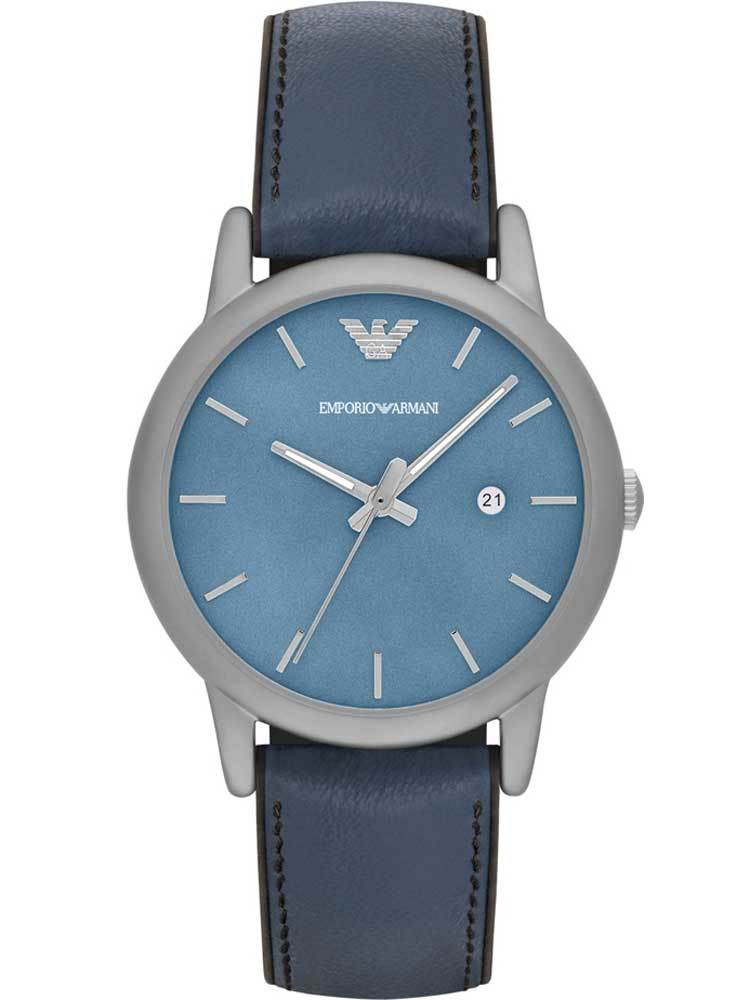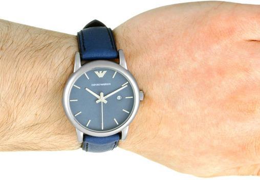 Корпус из нержавеющей стали с синим кожаным ремешком. Фиксированный безель. Синий циферблат с серебристыми стрелками и часовыми метками. Тип : аналоговый. Отображение даты в позиции 3 часа. Кварцевый механизм. Устойчивое к царапинам минеральное стекло. Размер корпуса: 41 мм. Толщина корпуса: 10 мм. Круглая форма корпуса. Ширина полосы: 20 мм. Танг застежка. Водонепроницаемость на 50 метров / 165 футов.