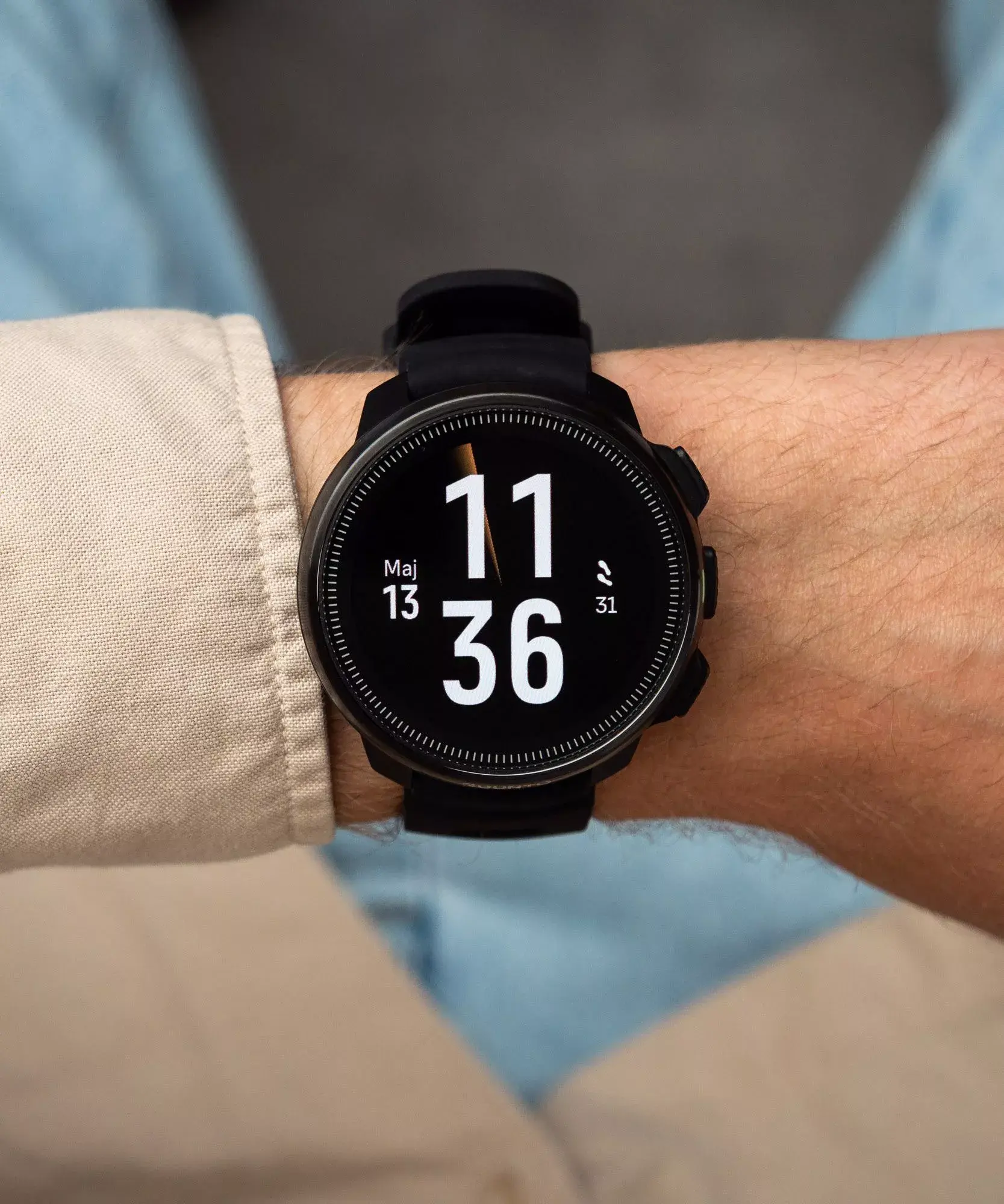 Цветной сенсорный AMOLED циферблат 1,43‘’ с разрешением 466x466. Настраиваемые экраны и подсветка. Дополнительные функции: второй часовой пояс, секундомер, SPLIT-хронограф, таймер, будильник, время восхода/захода солнца, автоматический переход на зимнее и летнее время. Датчики: барометрический альтиметр, электронный компас, термометр.