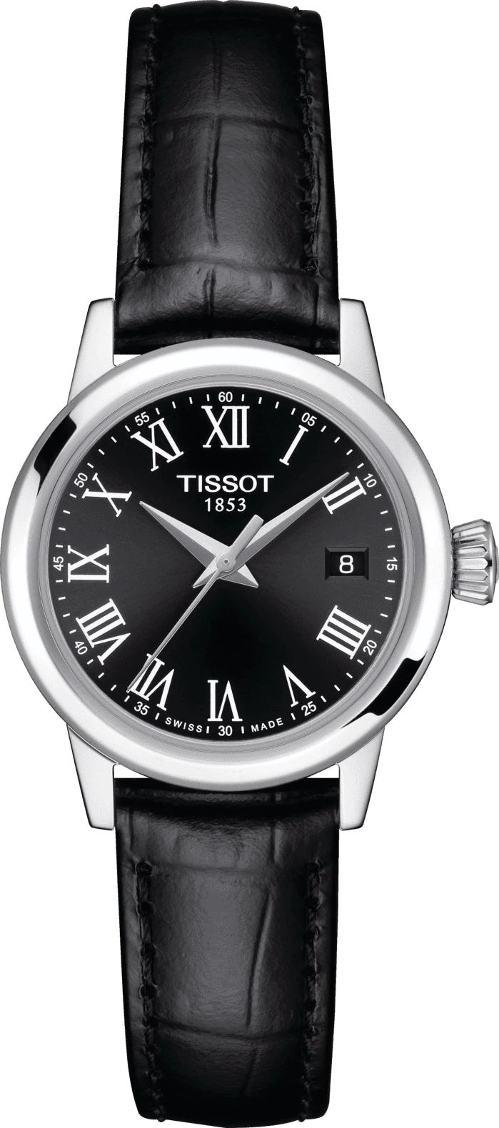 Серебристые римские цифры придают выразительности простому черному циферблату, который комплектуется сапфировым стеклом, устойчивым к появлению царапин. Небольшой стальной корпус серебристого цвета оснащен швейцарским кварцевым механизмом, который обеспечивает часам Tissot высокую точность хода.
