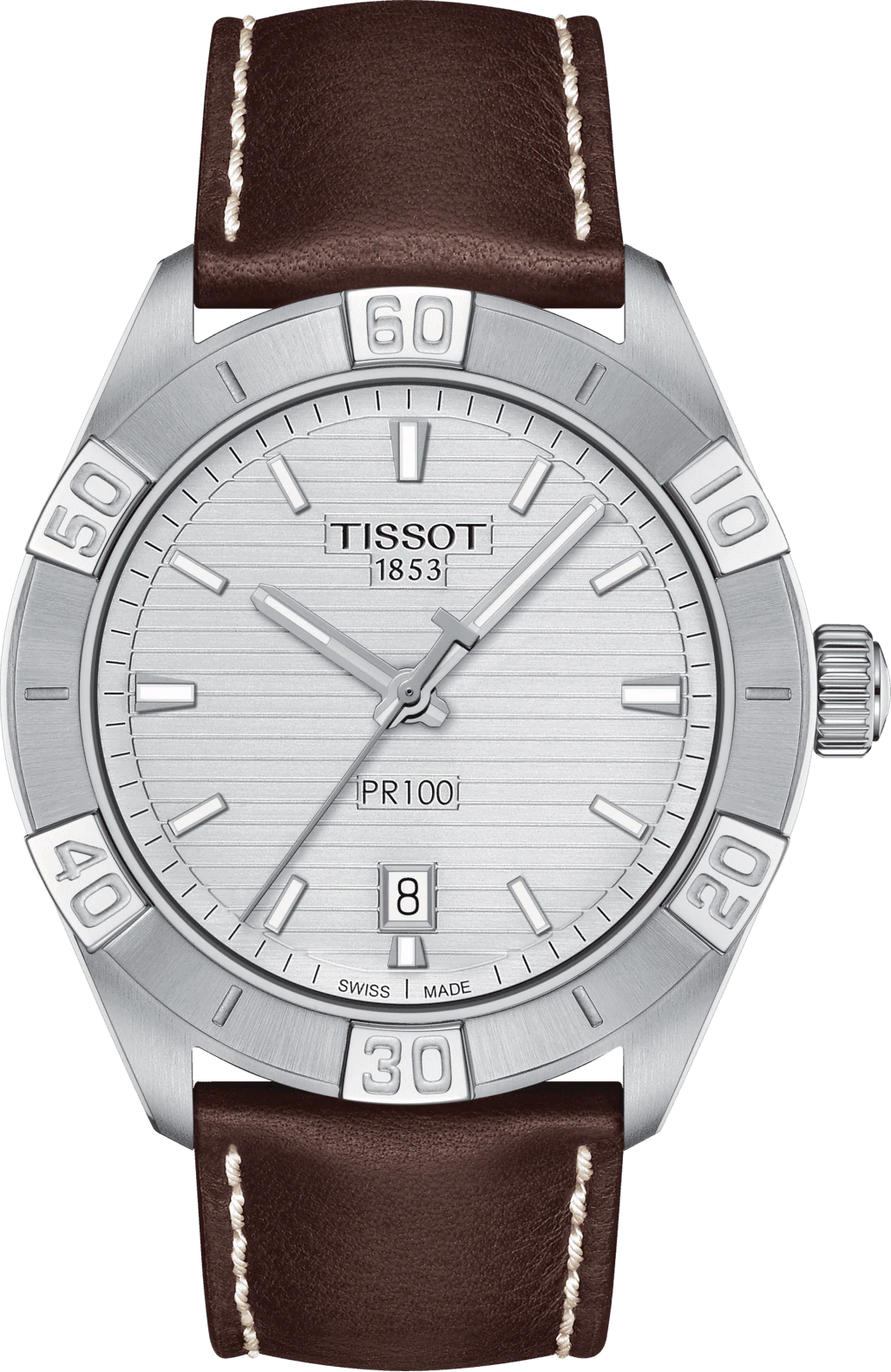 В стальном корпусе часов Tissot с широким безелем находится точный кварцевый механизм, а коричневый ремешок из натуральной кожи декорирован строчкой из белой нити и оснащен удобной стандартной застежкой.
