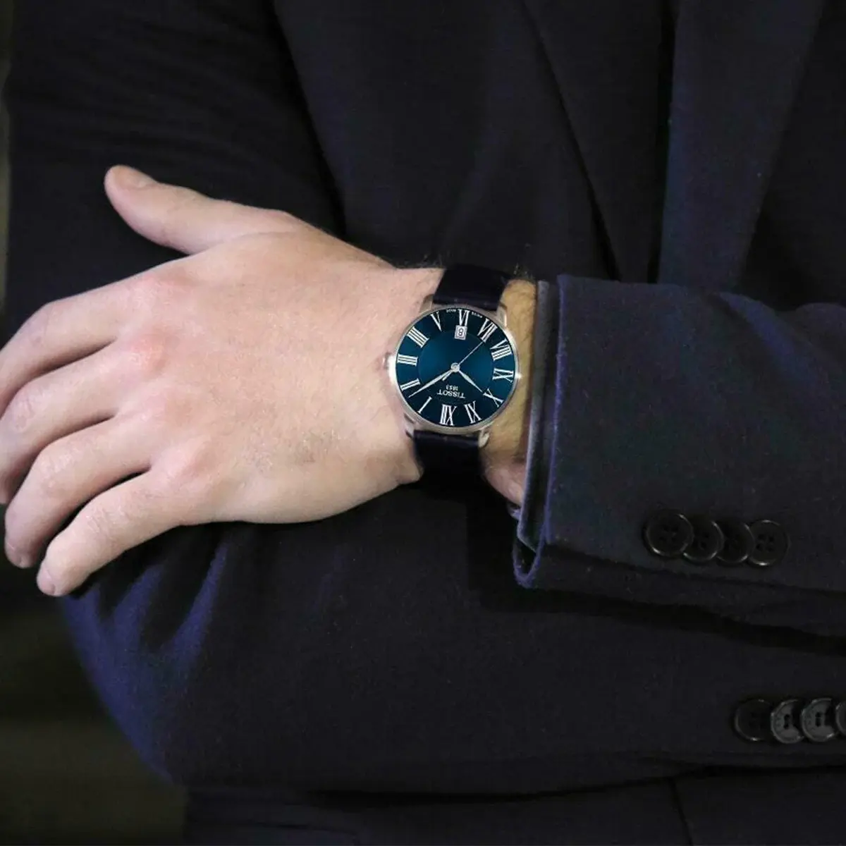 Серебристый корпус из нержавеющей стали с синим кожаным ремешком. Фиксированная серебристая рамка из нержавеющей стали. Синий циферблат с серебристыми стрелками в форме листьев и часовыми метками с римскими цифрами. Тип набора: аналоговый. Отображение даты над позицией 6 часов. ETA Caliber F06.115 кварцевый механизм. Устойчивый к царапинам сапфировое стекло. Потяните / подтолкните корону. Сплошной чехол назад. Форма корпуса круглая, размер корпуса 40 мм, толщина корпуса 6,97 мм. Ширина полосы: 20 мм. Застежка с пряжкой. Водонепроницаемость на 50 метров / 165 футов. Функции: дата, час, минута, секунда.