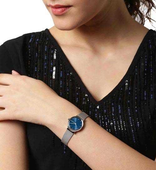 Женские кварцевые часы из серии Freja. Круглый корпус из нержавеющей стали. Синий циферблат украшен кристаллами. Минеральное стекло. Водозащита 30 м. Стальной браслет миланского плетения.