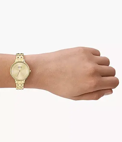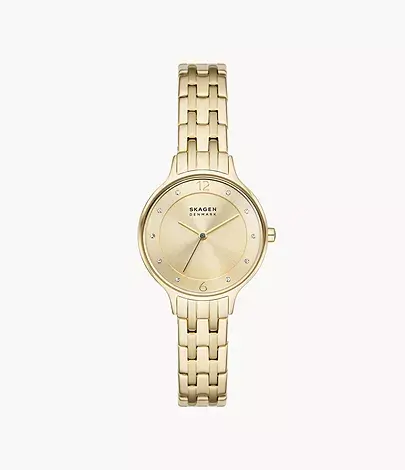 Skagen Anita Lille Silver 30 mm — стильные женские часы с корпусом из нержавеющей стали шириной 30 мм и толщиной 5 мм золотистого цвета. Браслет этих женских часов — стальной браслет шириной 12 мм в месте крепления. Циферблат Skagen Anita Lille Silver 30 mm неподвластен времени благодаря гильошированию в виде солнечных лучей и защищен минеральным стеклом. Индексы часов украшены драгоценными камнями. Часы водонепроницаемы до 50 м / 5 атм, то есть имеют ограниченную водонепроницаемость (не рекомендуется для плавания).